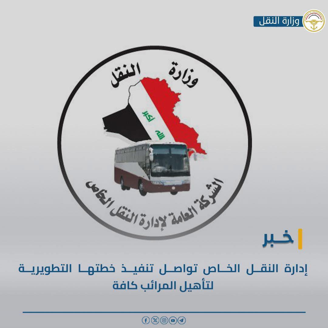 تواصل الشركة العامة لإدارة النقل الخاص ،تنفيذ خطتها التطويرية لتأهيل المرائب كافة التي تحتاج إلى صيانة وتطوير لخدمة المواطنين والسائقين. وقال المدير العام الدكتور أحمد ايوب الموسوي ، وضعت شركتنا خطط شاملة لتطوير قطاع النقل الخاص مع بداية تسنم حكومة الخدمات مهام عملها، حيث يتم تأهيل كافة المرائب المنتشرة في بغداد والمحافظات، التي تحتاج إلى صيانة وتطوير.